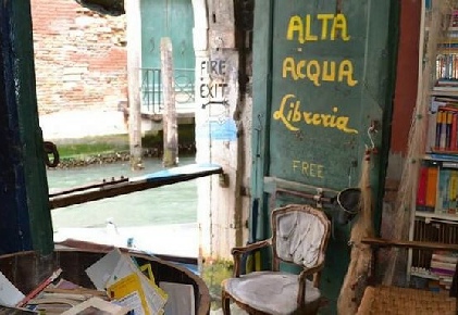 Il existe une bien curieuse librairie à Venise, c’est « l’acqua alta » ! Il faut se perdre dans un dédale de ruelles où l’on croit toujours arriver dans une impasse … pour la trouver !